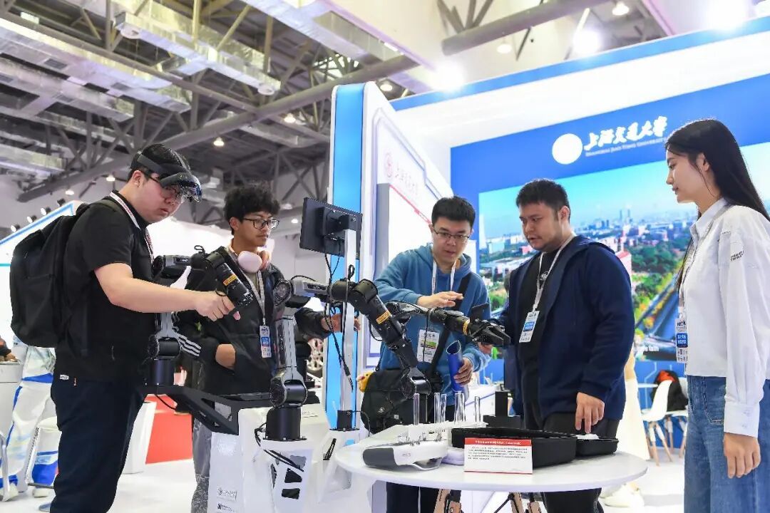公众在第 63 届年度高等教育博览会上了解机械臂。图片提供:新华社记者张楠。