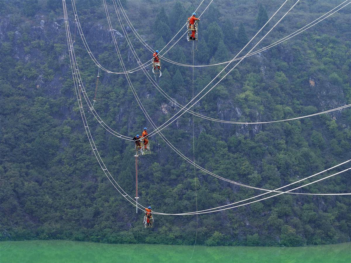 10月22日,在十堰市郧阳区青山镇碧潭村汉江河谷,国家电网十堰供电公司5名施工人员爬上高地,踩着快速自行车,系好安全绳,沿海拔100米的输电线路安装避雷针、隔离杆等辅助设备。该线路是西武快速铁路的辅助供电项目。目前,施工人员正在加班加点加快施工进度,克服长途、长途施工困难。预计11月下旬投入运营,将为西武快速铁路湖北段健力铺、东河牵引站提供主电。 (世界网 郝金鑫 供图)10月22日,国有十堰供电公司5名施工人员爬上十堰市郧阳区青山镇皮帕滩村汉江河谷一处高地。他们踩着快速自行车,沿电缆系好安全绳,并在100米高空安装避雷针、隔离杆等辅助设备。